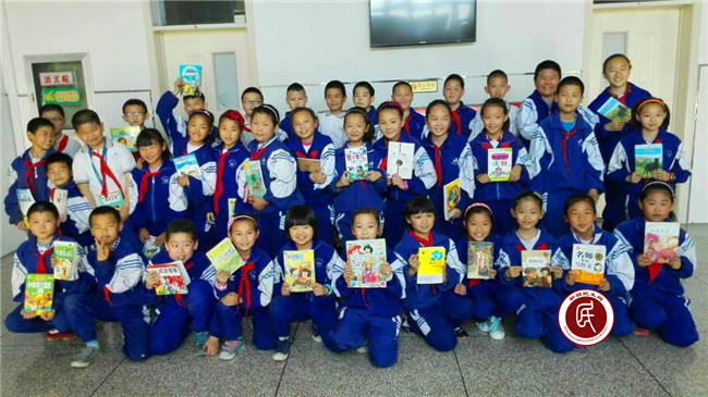 乌鲁木齐市第44中学四年级(五班)的小学生在展示他们全班为南疆孩子们的爱心书籍。