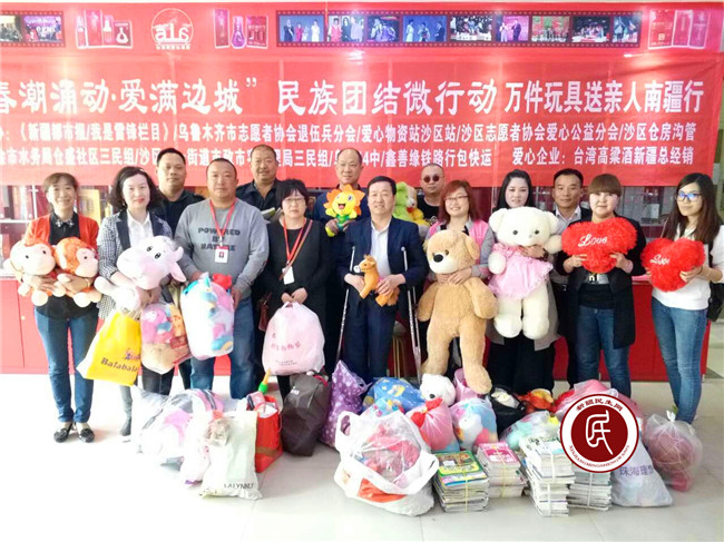 这是由乌鲁木齐志愿者协会退伍兵分会联合《新疆都市报(我是雷锋栏目)》,与乌市多个社区、幼儿园、学校等单位共同组织开展的为期一周的“春潮涌动.爱满边城”万件玩具送亲人南疆行民族团结微行动活动现场看到的一幕。
