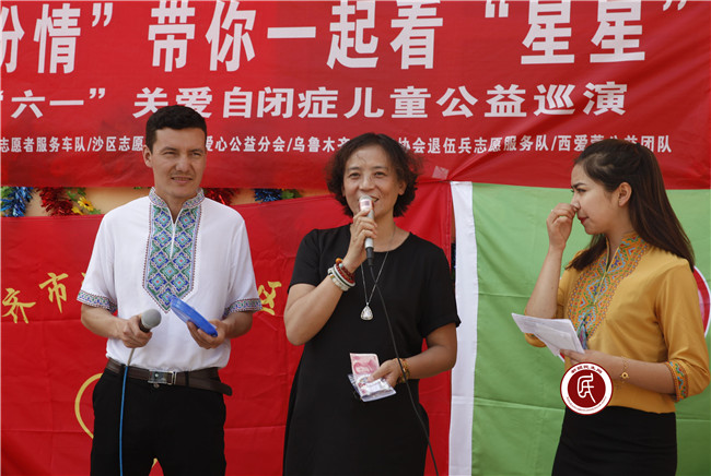 当日,来自乌鲁木齐市的150余名汉、回、哈萨克、维吾尔等多个民族的志愿者们用爱心人士认购残障儿童手工艺品、赠送盆栽花卉、头卡头绳、水彩笔油画、饮水机、爱心衣物、连环画图书的方式表达对智障儿童的关爱关注。