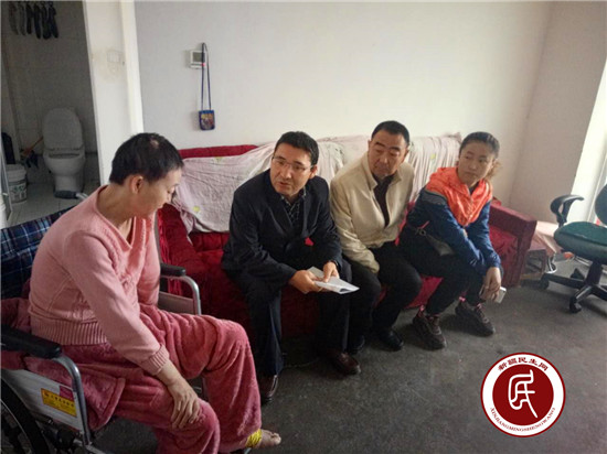新疆民生网讯 (通讯员 考赛尔汗)近日,昌吉市北京南路街道毛纺厂社区、“访惠聚”工作组一行来到凯迪名苑小区低保户陈玉萍家,将2000元爱心基金送到她手上,缓解陈玉萍治病之需,这是自北京南路街道毛纺厂社区及“访惠聚”工作组成立了“爱心基金”以来实施的第七次现金救助。
