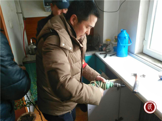 志愿者刘平大家都称是“刘工”,今天带着儿子来看望“妈妈”。父子今天的任务是帮助阿依孜.木汗大妈修理橱柜。
