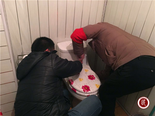 “刘工”父子兵继续合作,为阿依孜.木汗大妈更换新的马桶盖。