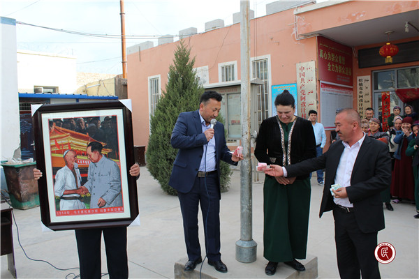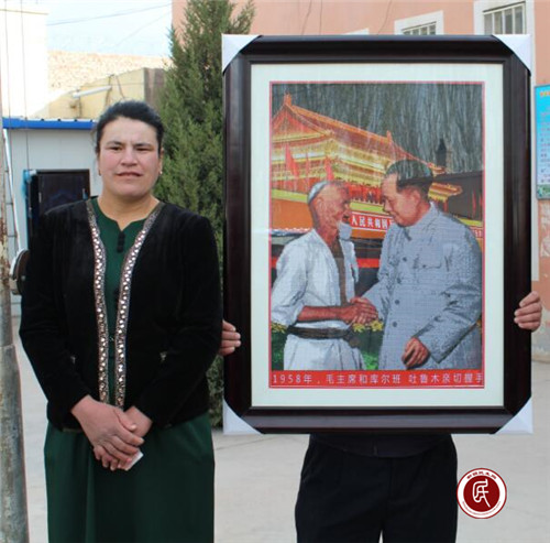 新疆民生网讯 (通讯员 文∕田丽  图∕艾合旦木·艾克拉木)4月3日,升国旗仪式结束后,阿孜汗村贫困户聋哑绣娘吾丽古丽·吐尔逊把她精心制作的十字绣新作——“毛泽东和库尔班·吐鲁木亲切握手”、黄金满地全景图等一一呈现在众人面前。