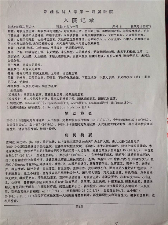 新疆民生网讯 阿克苏市水利局驻巴什巴格村工作队在入户走访中得知该村1组农民阿里木·吐尼亚孜的长子依明江·阿里木在阿克苏地区人民医院初步检查诊断结果为再生障碍性贫血、消化道出血、急性上呼吸道感染、浓度血症、电解质带紊乱。依明江·阿里木于2007年9月8日出生,今年10岁,为了争取最佳治疗时间,依明江·阿里木要尽快住院治疗,需要65万元左右治疗费。阿里木·吐尼亚孜家有四口人,耕地少、缺乏劳动力、收入低,根本解决不了这笔昂贵的医疗费用。阿克苏市水利局驻巴什巴格村工作队了解了他家的实际困难后筹钱支付了医药费用,但无法支付昂贵的医疗费用,为帮助他们发布了这篇求助信息,需要广大爱心人士及团体伸出援助之手。