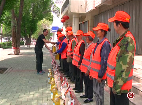 乐土驿镇党委副书记张雷看望慰问环卫工人,并为他们发放大米和清油等物品,向他们的辛勤付出表示衷心的感谢。
