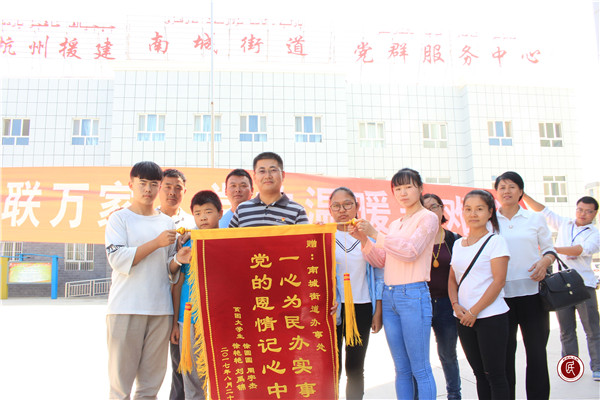 9月4日,受到金秋助学的徐园园代表12户贫困居民,向阿克苏市南城街道办事处送来了一面“一心为民办实事,党的恩情记心中”的锦旗,表达他们对街道帮助上学的一片感激之情.