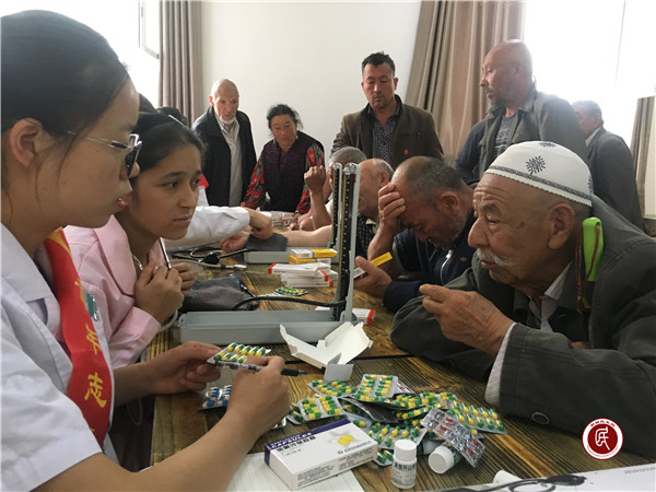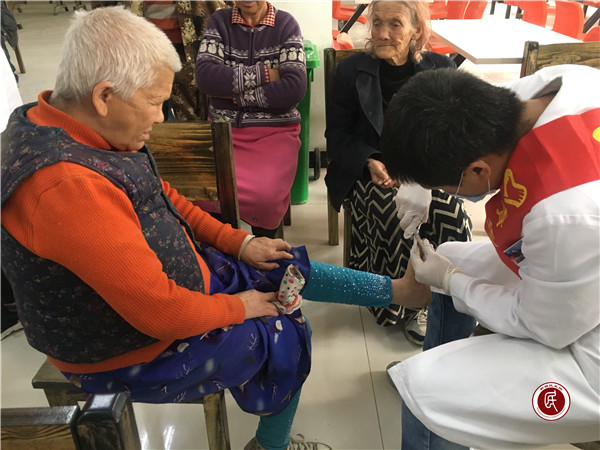 医疗服务组也没有闲着,桌上整齐地摆放着血压仪、血糖仪、听诊器等诊疗仪器和家庭常用药品。医务工作者一边为老人们把脉问情、听诊心肺;一边根据身体状况对症送药,反复叮嘱药品用法用量和生活起居应注意的事项,用心呵护老人们的健康生活。
