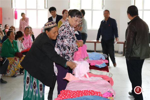 新疆民生网(刘丹)“阿孜古丽你穿这件粉色的裙子,适合你的肤色,穿上肯定漂亮……”在叶城县夏合甫乡英阿瓦提村爱心微公益捐赠现场,第一书记徐海虹正在为村民挑选合身的衣服。