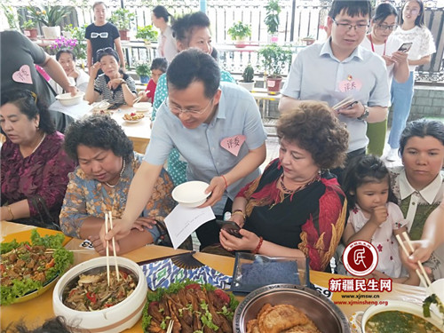 “哇,这个火锅鱼味道太棒了”“嗯,这个大盘鸡也不错”……这是来自和平社区百家宴活动现场的声音。近百名各族居民群众,纷纷端出自己的拿手好菜,摆成了一桌丰盛的百家宴,大盘鸡、红烧鱼、油炸肉包、椒麻鸡、烤鸭等各色美食,让居民们食欲大开,不时传来“好吃”“真香”的称赞声。由联点单位、“访惠聚”工作队、社区居民组成的评委,通过色泽、香气、味道、外观、营养、创意这六个方面对菜品进行打分,最终评出18道受欢迎程度最高的特色菜品。