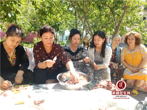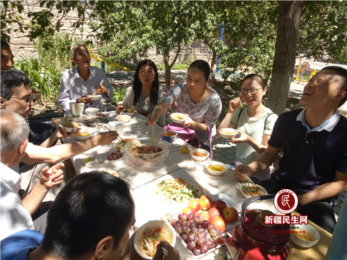 看,茂密桑树下这几张拼起的长桌上,摆满了热腾腾的抓饭、香气扑鼻的椒麻鸡、美味凉菜,还有桃子、葡萄、西瓜、瓜子等等。各族居民围坐在一起,边吃边聊,好不惬意!