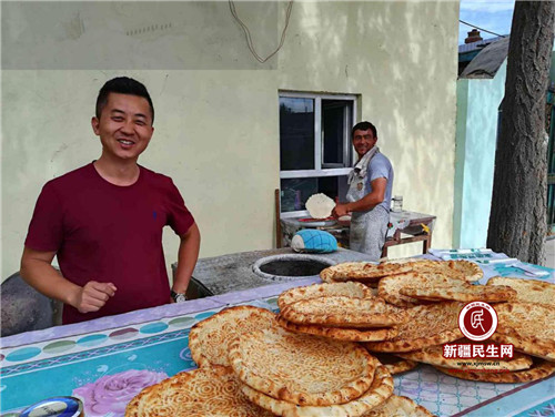新疆民生网(陈南希 栾超)7月5日一大早,石鑫和他的维吾尔族兄弟外力·萨塔尔就开始忙活了,“今天有人预订了100个馕,我凌晨四点钟就开始准备了。”外力开心地说。“打馕是个辛苦活,我这个兄弟很能干的!”石鑫拍着外力的肩膀夸赞道。