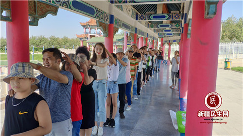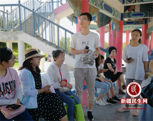 活动的地点选择在九龙潭,九龙潭对于克拉玛依具有及其特殊的意义,它的的出现结束了克拉玛依无水的历史,更为这座城市的发展注入灵魂。在极具中国传统建筑的长亭楼阁下,坐满了参加活动的干部群众和结对亲戚,认真地听导游讲述克拉玛依和九龙潭的故事。