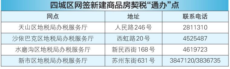 按照市地税局契税业务分流工作步骤,四区地税局与市地税局第一分局负责办理除乌鲁木齐县、米东区、农十二师以外地区的网签新建商品房契税“通办”业务。