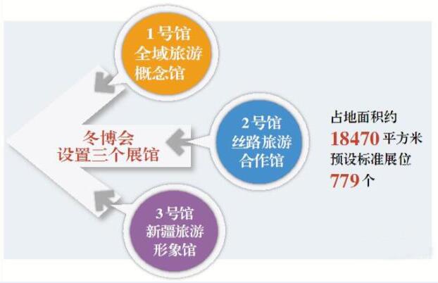 本届冬博会共设置三个展馆,分别是1号馆全域旅游概念馆、2号馆丝路旅游合作馆、3号馆新疆旅游形象馆。占地面积约18470平方米,预设标准展位779个。
