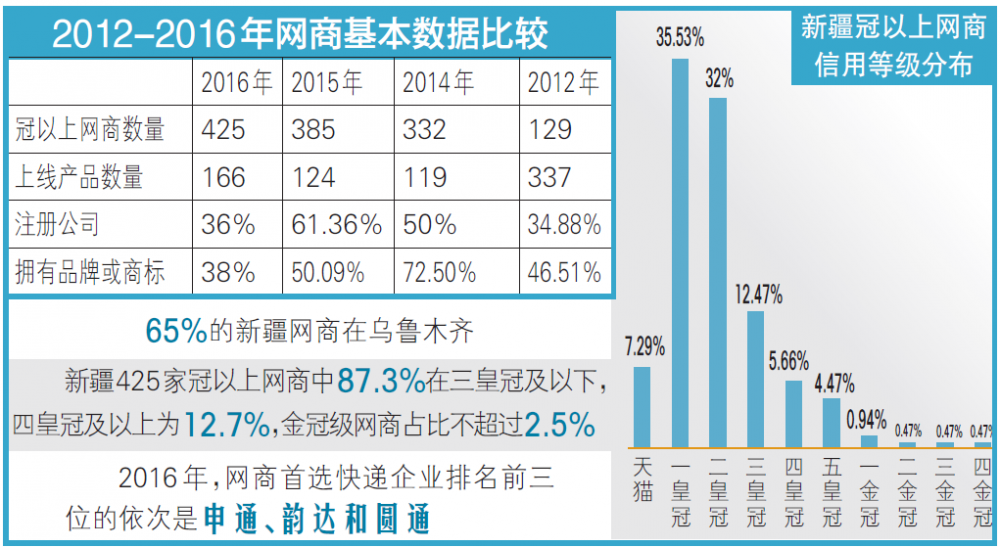 《报告》显示,2016年,新疆425家冠以上网商中,277家在乌鲁木齐市,占比达65.18%;而在2012年,乌鲁木齐的冠以上网商数量占全疆的74.81%。