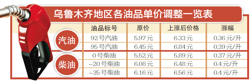 新疆网讯(记者李宁艳)15日零时起,汽柴油零售价迎来年内最大涨幅,而这也是近四年来的最大涨幅。乌鲁木齐92号汽油每升上涨3毛6,达到每升6.33元。