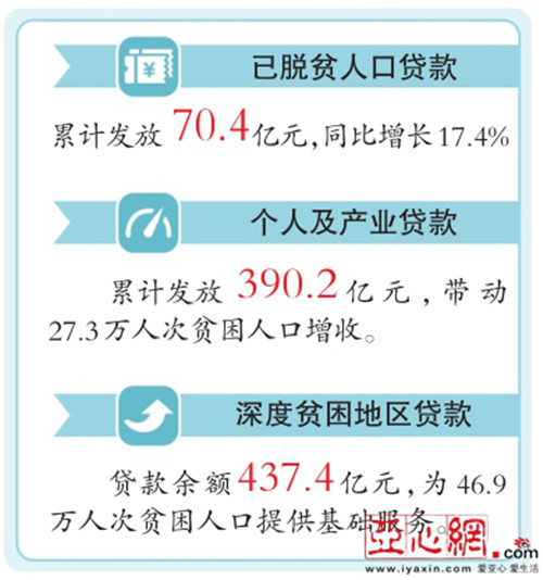 亚心网讯(记者马蓓报道 制图/杨波)去年,新疆金融业助推脱贫攻坚成效显著。金融扶贫力度不减,已脱贫人口贷款大幅增加。2018年累计发放已脱贫人口贷款70.4亿元,个人及产业精准扶贫贷款快速增长,带动27.3万人次贫困人口增收。