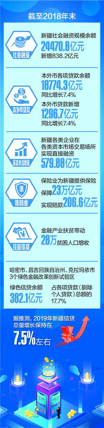新疆日报讯(记者王永飞 邹懿摄影报道)截至2018年末,新疆社会融资规模余额24470.8亿元,新增838.2亿元;本外币各项贷款余额18774.3亿元,同比增长7.4%……