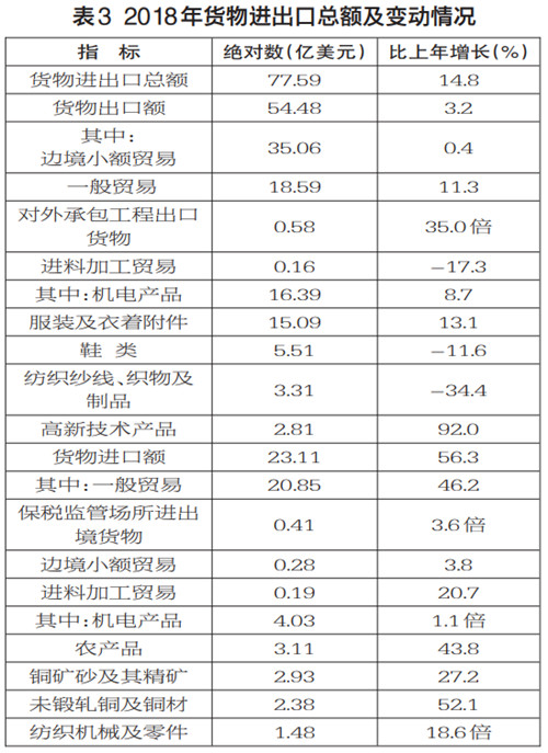 据海关统计资料显示,全年实现外贸进出口总额77.59亿美元,比上年增长14.8%,其中,出口54.48亿美元,增长3.2%;进口23.11亿美元,增长56.3%。