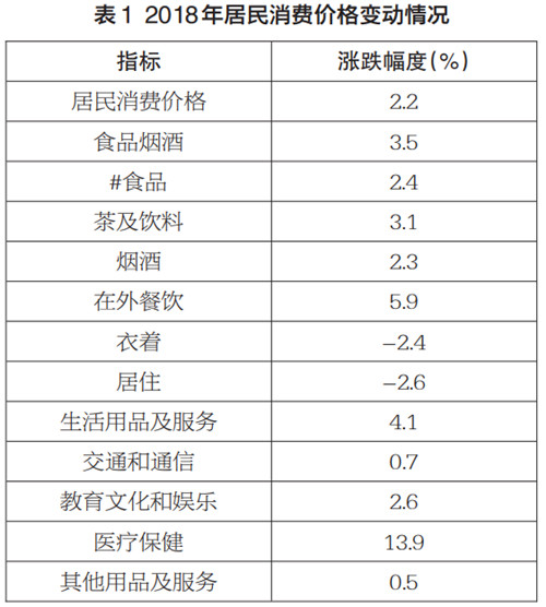 全年居民消费价格比上年上涨 2.2%。其中,食品烟酒类、生活用品及服务类、交通和通信类、教育文化及娱乐类、医疗保健类和其他用品及服务类分别上涨3.5%、4.1%、0.7%、2.6%、13.9%和0.5%;衣着类和居住类分别下降2.4%和2.6%(见表1)。