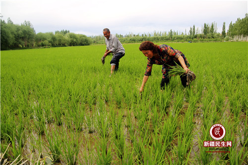 新疆民生网(颜寿林)6月10日,温宿县托乎拉乡托万克苏布拉克村农民在稻田里人工拔草。据悉,今年,温宿县狠抓选用优良稻种、科学育秧、机械插秧、人工拔草、追肥放水等增产技术措施,促使全县11万亩水稻秧苗返青长势好,为今年水稻增收丰收打下了基础。