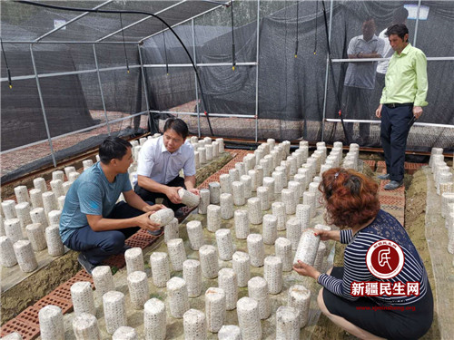 正在给木耳洒水的贫困户阿布拉·沙迪克开心地说:“政府专门为我们木耳基地配备了技术指导员,每天都来基地手把手的教我们种植技术,现在我已经学会了木耳种植的基本知识,对今年脱贫我充满了信心,共产党亚克西。”