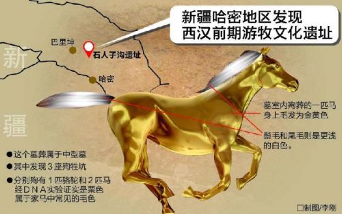 中国社科院考古所的研究人员日前在对新疆哈密地区一处西汉前期的游牧文化遗址里出土的整马遗骸进行DNA实验分析后,惊奇地发现其中一匹与墓主人同葬于墓室的马竟是罕见的金黄色。