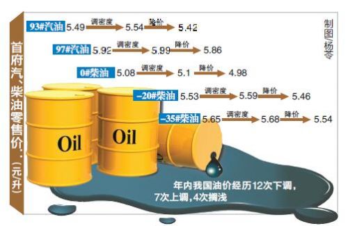 1日下午,国家发改委通知,决定今日零时起将汽、柴油价格每吨分别降低145元和140元,测算到零售价格90号汽油和0号柴油,全国平均每升分别降低0.11元和0.12元,这是国内成品油价年内第12次下调,最近三个调价周期内的“三连跌”。
