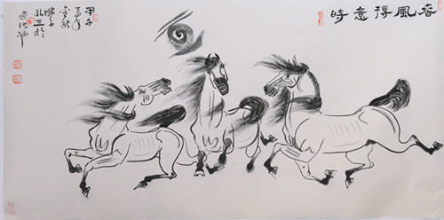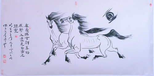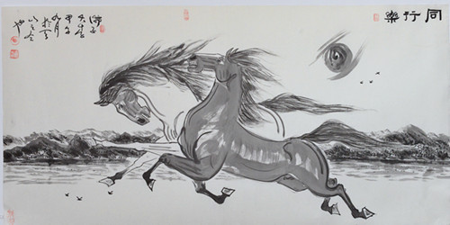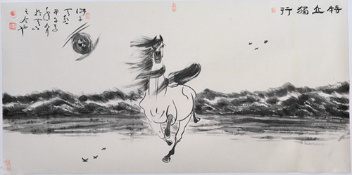 今年是甲午年,按中国的干支历法,十二生肖属马谓之“马”年。于是乎画马大家“遍地英雄”下夕烟。画马者风起云涌,而以绘马、画马、以马为师的李举伟还是那样的坦然和淡定,他依然是那样的随心所欲,他依然是那样的笔走龙蛇,把一幅幅飞翔的马、奔腾的马、刨蹄待发的马、相濡以沫的马……奉献给平民、乡亲、父老、企业家,人民的公仆。很多冒牌的画马专家应运而生的时候。笔者突然想起郭沫若先生的“甲申三百年祭”。当然,不是因为今年是甲午而让笔者想到甲申,但要提及的是这其中渊源,还是值得汲取的。无论是对政、商、艺……界都是有裨益的。开国领袖毛泽东(大诗人、大书法家)在一九四四年被中共中央列为延安整风的文件。毛泽东在《学习和时局》一文中指出“我党历史上曾经有过几次表现大的骄傲,都是吃了亏的”。而今的书画界,骄傲之风盛行,自以为是者盛行。也因此而使笔者想到李举伟的书法作品能有今天的建树,这与他的谦虚为人、谨慎做人、以诚待人、虚心好学、以马为师,云游万里江山是分不开的。更主要的是吸大地之地气、万物之灵气、众生之和气,山川之秀气,集平民之人气、集自身之勇气,出山亮剑我行我素,走自己的路,爬我的山,夸我的河,越我之海,哪管风吹浪打胜似闲庭信步,画我之马,写我之书法,让招摇者无可奈何,让傲胜者不敢鸟瞰,让自诩者不可同语,让同伍者携手共进。