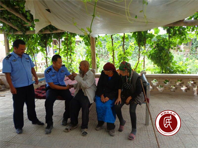 新疆民生网兵团第一师7月19日讯(通讯员 范西恩)“我74岁了,无儿无女,虽然这里有专人照顾我们的吃喝,但是我还是觉得太孤单了。自从文鹏、俞磊、阿米都拉这些民警来到这里,帮我们打扫卫生、整理房间,平日里嘘寒问暖,逢年过节时带着慰问品来坐坐,陪我们说说话,我觉得自己虽然没有亲生子女,但我有一群警察儿子。”新疆生产建设兵团第一师五团民族分场幸福院里的孤寡老人居曼·塔吉拉激动的说。