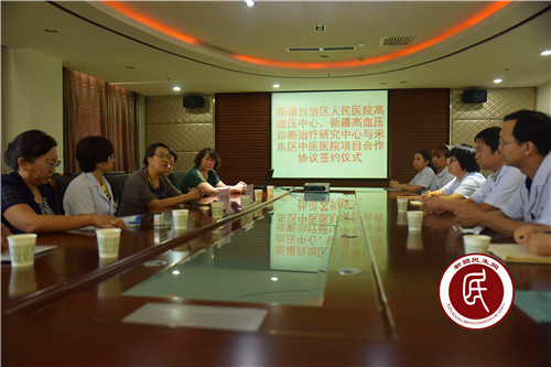 新疆民生网讯(通讯员 孙振嵩 彭慧)为进一步加大对乌鲁木齐市米东区广大群众高血压病预防和诊治水平,让居民在家门口就能享受到优质、高效的医疗服务。 8月4日下午,新疆维吾尔自治区人民医院高血压中心、新疆维吾尔自治区人民医院高血压诊断治疗研究中心与乌鲁木齐市米东区中医医院签订了《高血压诊治及分级管理项目》合作协议书。