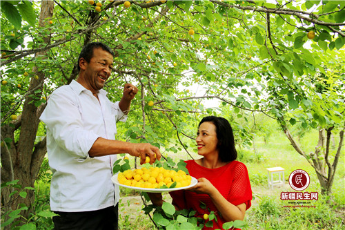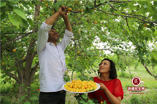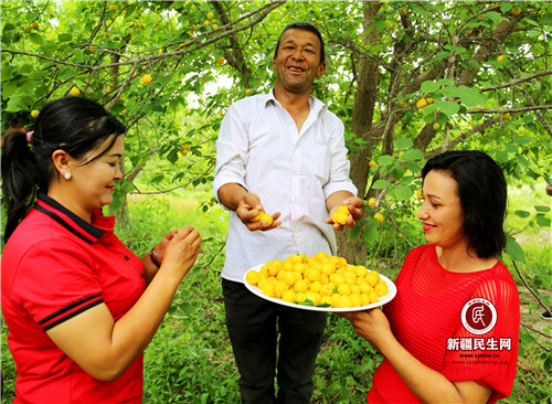 新疆民生网(颜寿林)7月1日,游客在温宿县阿热勒镇托万克买盖提村一家农业生态园采摘杏子。近年来,温宿县注重打造“农旅融合”特色产业,带动当地村民特别是贫困群众增收,加快建设美丽乡村。