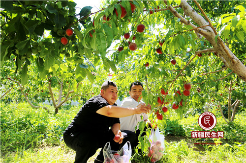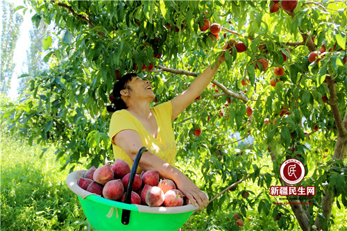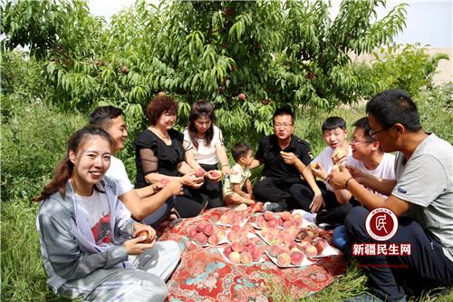 新疆民生网(颜寿林)7月7日,游人在温宿县柯柯镇光明生态采摘园里采摘血桃,享受田园乐趣。时下,位于该镇帕克勒克景区路边光明生态采摘园60亩血桃成熟,甜蜜可口的桃子吸引不少游客到采摘园体验采摘乐趣。