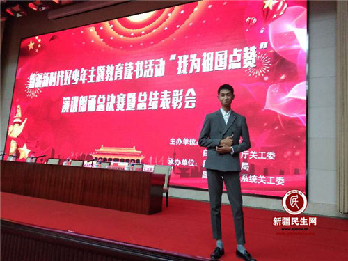 巴州第一中学的依斯坎的尔·艾合买提同学追历史、赞今天、望未来,用自己优美的音色和抑扬顿挫的演讲倾诉着对祖国的满腔的赞美之情,赢得了现场阵阵掌声。最终不负众望,从高中组众多选手中脱颖而出,喜获高中组演讲一等奖,将代表自治区赴延安参加全国总决赛!
