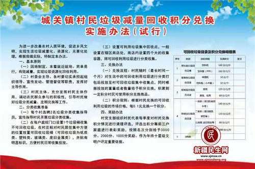 为调动村民的参与力度,全镇范围实施垃圾分类,城关镇在广做宣传的同时出台了《城关镇村民垃圾减量回收积分兑换实施办法》,选山坡村做示范,以点带面,由各村垃圾分类收集指导员对正确分类投放生活垃圾的村民按照《可回收垃圾目录及积分兑换明细表》现场折算成积分,累计到一定积分后村民可根据可回收利用垃圾的市场价格在镇政府规定的商店按一个积分0.1元,兑换同价位商品。村党支部组织村民代表每季度对村民兑换积分情况进行清理评选,评选出积分靠前三户家庭进行表彰奖励,按照名次分别给予3000分、2000分、1000分奖励。作为年终十星级文明户评定重要依据。这样一来,不仅让当地环境美起来,也让村民们养成了垃圾分类的好习惯,以助推该工作开展,力争到2020年底,实现可回收生活垃圾回收利用率达100%以上。