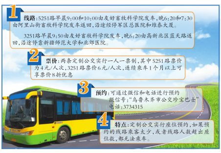 现在,市民可通过微信和电话两种方式进行预约。一是搜索微信公众号 “乌鲁木齐市公交珍宝巴士”,进入微信公众平台界面,点击“服务台”菜单,进入“定制公交”页面填写出行需求。工作人员将定期进行统计和整理,如果同一区域市民出行需求达到通车条件,将会开通定制公交线路。此外,乘客还可拨打电话3734315进行预约。