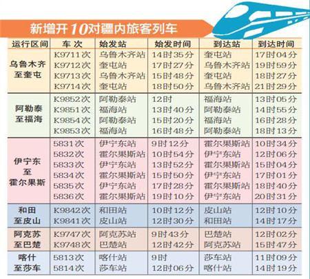 乌鲁木齐晚报讯(记者王艳红报道)3月14日,新疆铁路部门将对疆内旅客列车运行图进行调整,增开南北疆方向旅客列车10对,优化调整部分列车运行区段、停站时刻和客车车辆。调整后,铁路列车短途区域公交化更加突出,旅客出行将更加便捷、舒适。