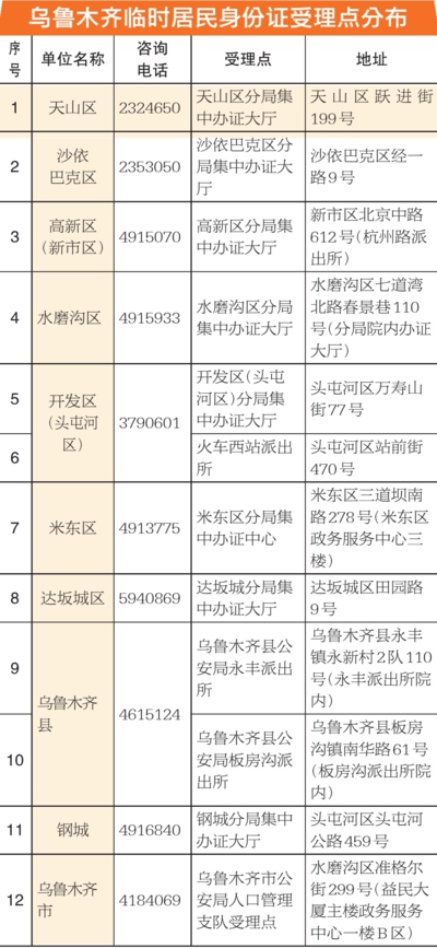 据市公安局人口管理支队相关工作人员介绍,新疆户籍高考生居民身份证丢失急需用证的,只要凭学生证、居住证、临时居住登记凭证、户口簿等证件的其中任意一项,就可以前往就近的乌鲁木齐市12个临时身份证办理点之一,申请办理临时居民身份证,无需排队,立等可取。