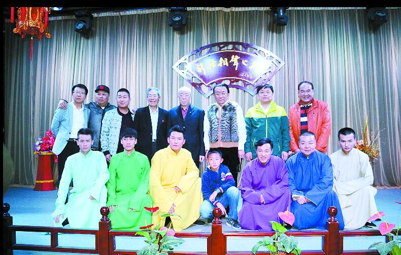 10月12日,中国著名相声表演艺术家侯耀华(后排右三),在新疆相声巴扎与新疆“老中青”三代相声爱好者合影留念。 (新疆相声巴扎供图)