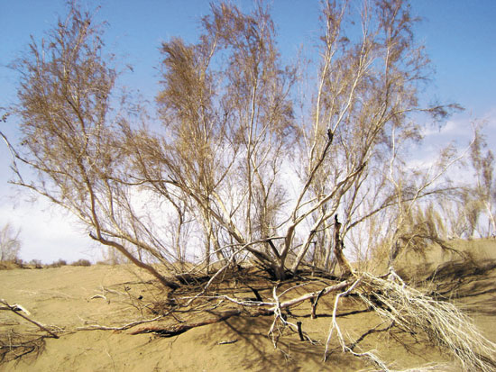 新疆网报讯(记者梁乐)在炎热干旱的古尔班通古特沙漠里,即便是抗旱性极强的梭梭,也会在夏季成片“死亡”。不过最近新疆科研人员却发现,梭梭具备一种奇特的“假死”本领,虽然地上部分枝叶干枯,毫无生气,但根系却能存活,只需一点点水分,就能在短时间内恢复活力。