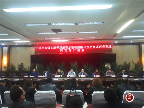 新疆民生网讯 (通讯员 佐富军)3月24日,由中国民族语文翻译局主办维吾尔语智能翻译及交互式语音翻译巡展活动在阿克苏市举行。中国民族语文翻译局信息处处长何燕龙,新疆民语委(翻译局)杂志社社长那依力江·吐尔干,阿克苏地区民宗委调研员、经文学校校长依米提·阿木提等出席了巡展活动,来自阿克苏市各行各业的民族语文翻译工作者及部分机关工作人员共计200余人参加了巡展活动。