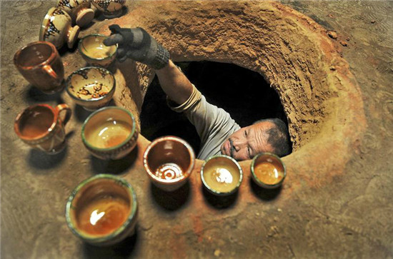 5月3日,喀什土陶艺人吾买尔江 · 艾力从窑里取出烧好的土陶产品