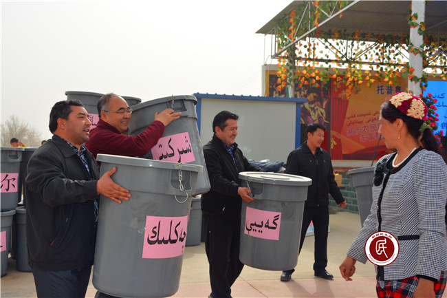 第二份礼物是工作组向村民代表发放了价值4万元的垃圾桶。为改善托普鲁克乡的村容村貌,工作组通过积极努力,争取到吉木萨尔县莱蒙钙业有限公司为当地捐赠了该批物资。垃圾桶将分布在全乡范围内主要街道、路口,方便村民堆放垃圾,并统一填埋,将极大的改善农村居住环境。