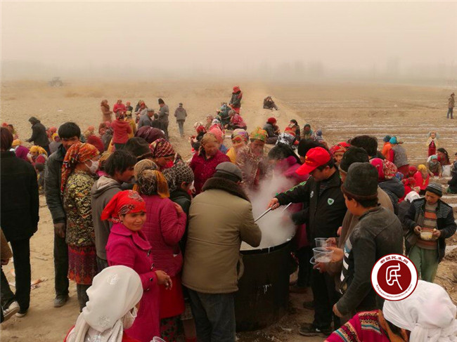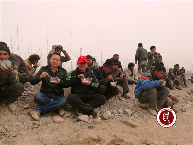 正午,经过工作组的用心烹制,两大锅美味的戈壁农民汤饭出锅了,工作组把买来的馕分给村民们,看着他们用热乎乎的汤饭泡着馕吃,我们开心的笑了。村民们吃过午饭后,又忙着植树去了。此情此景让工作组对这些朴实的村民们产生了由衷的敬意,他们来到戈壁滩来植树,为的是让生态环境变得更好些,造福子孙后代。