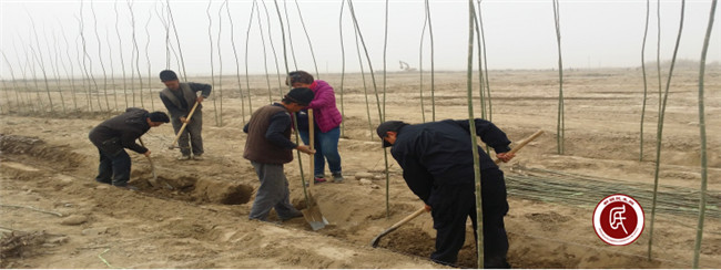 植树现场,村民们按照划分的地段,抡着坎土曼和铁锹,沿着事先拉好的线,每隔一段就挖一个树坑,采用“一埋、二提、三踏实”的方法填埋。植树的人中有个老人,面色黝黑,高高个头,身板硬朗,他挖的每个坑都是又大又深。住村干部对老人说,你挖的坑真标准,你种的树保准能活。通过双语干部的翻译,老人开心的笑了,笑脸中蕴含着赞同的含义。在和老人闲聊中,得知老人家庭生活困难,老伴身体不好,就是这样的老人,依然充满热情地参加植树劳动,让人深感敬佩。