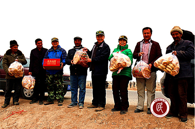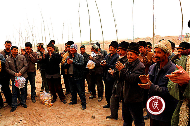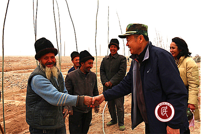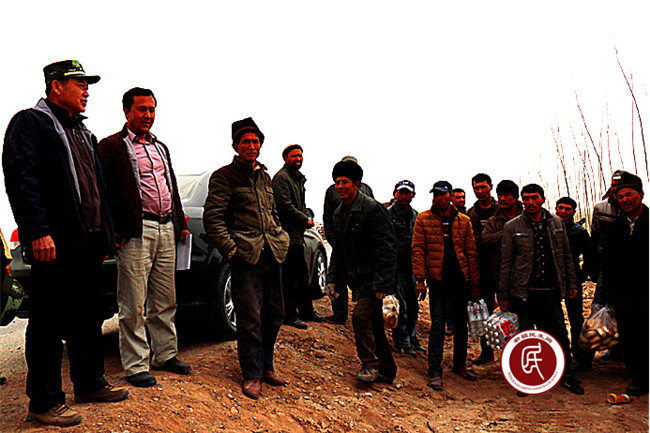 午饭的时间到了,工作组成员把馕和矿泉水送到村民的手上,在大家热烈的掌声中,住村工作组组长闫泽武代表工作组对村民的辛勤劳动表示慰问,他说:“大家辛苦了!我们工作组到植树现场是来向大家学习的,大家参加防风固沙、植树绿化是功在当代,利在千秋的好事,是在通过辛勤的劳动把家乡建设的更加美好,是在为我们的子孙造福,大家在沙尘天义务植树,让我们很感动,我们村的乡亲们是好样的,请大家注意安全,保重好身体,今天来慰问大家和参与劳动,是来表达对您们的敬意。”