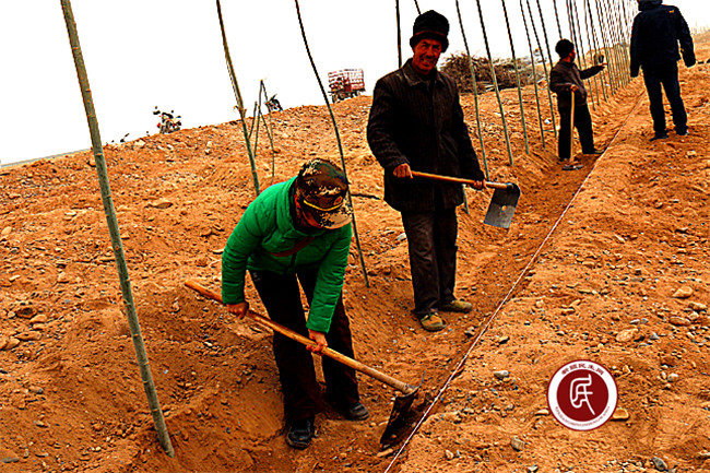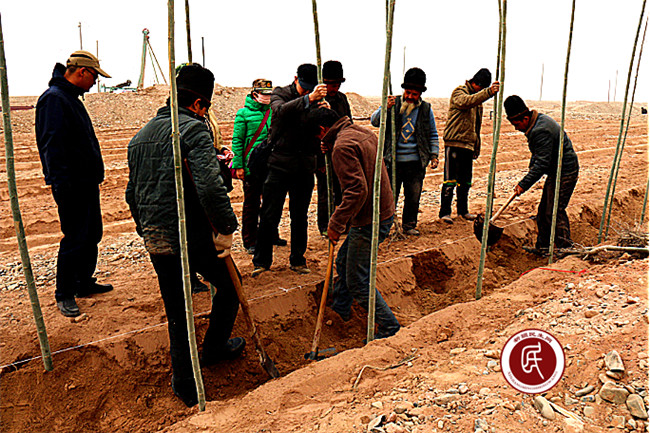 新疆民生网讯(通讯员 梁栋)春回大地,万物复苏,新芽吐蕊。英吉沙县10万亩防风固沙林工地植树的群众干的热火朝天。为进一步保护生态环境,弘扬义务植树精神,倡导绿色文明理念,一个新的植树造林高潮正在广阔的戈壁滩上展开。此次植树造林活动,英吉沙县萨罕乡分配给库如克铁热克村(19村)500余亩任务,村里组织了200余人的植树队伍加入到热火朝天的造林绿化会战中,在用实际行动为家园增添一份绿色,用勤劳的双手为哺育他们的大地母亲披上一层绿色的新装,也为治理南疆季节性沙尘天气尽他们一份微薄的力量。