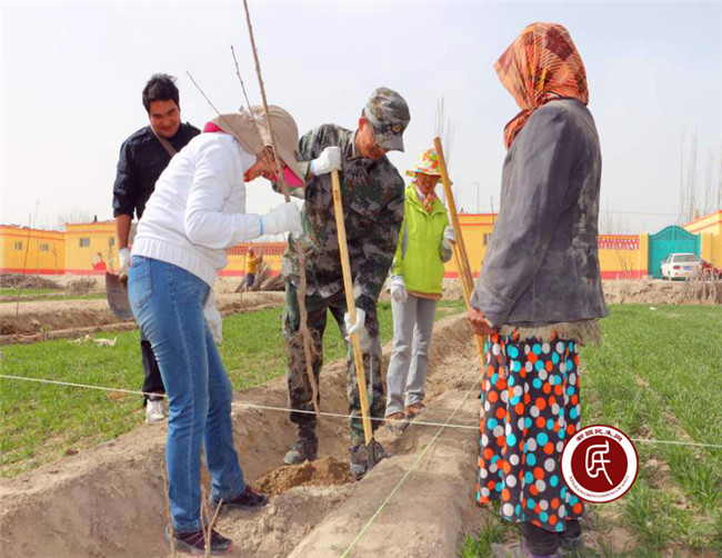 根据艾力西湖镇关于今年农业种植的总体安排,全镇计划种植樱桃一万亩,诺其巴扎村也分配了几百亩。3月17日,住村工作组的同志们扛着铁锹,拿着坎土曼,迈着轻快矫健的步伐走向麦苗葱绿的田地。诺其巴扎村东临叶尔羌河中游,河水充沛,在南疆属于较潮湿气候。阳春三月,杨柳吐絮、到处春意盎然。大家看见住村工作组的同志们来了,都纷纷上前握手问好表示欢迎。技术员给大家讲解了樱桃苗坑挖的深度,树苗种植的高度,埋土的踩踏程度等。其实民间流传着一句俗语叫做:“樱桃好吃树难栽”。一般情况下樱桃要生长七、八年才能结果,而这次种植的改良樱桃苗只需三年生长期,而且经过嫁接后个头大、产量高。大家随即散开热火朝天地干了起来,他们有的挖坑、有的栽苗、有的埋土、有的拉线……虽然是农活,但是并不粗糙,种植要求非常严格,必须保证横成行、竖成列。每个人都紧跟节奏,很快一片条田就种完了,看着小苗一棵棵整齐地排列在田野上,大家都露出了欣慰的笑容。