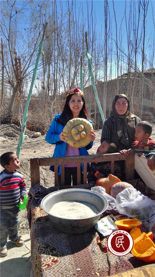 活动开始了,做饭的大师傅挽起袖子,架起大铁锅,生起火,往锅内倒入满满的水。几个大叔大婶主动过来帮着淘米洗菜切肉,他们一边忙的不亦乐乎,一边还不停拿起手中的食材教我说维语:大米是“古如洗”,肉是“锅洗”,南瓜是“卡娃”,葡萄干是“一米洗”。一个大婶摘下自己的小花帽乐呵呵的戴在我头上,又把一个大南瓜塞到我怀里,示意我摆POSE照张相,真是太有趣了。
