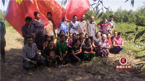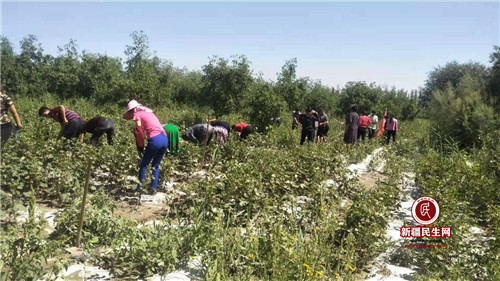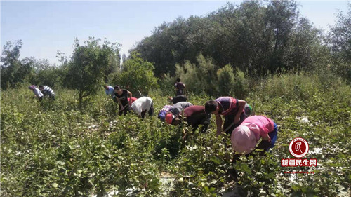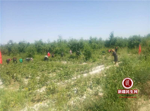 新疆民生网(白亿道)2019年7月23日,阿克苏市喀拉塔勒镇阿热博孜其村驻村工作队组织工作队全体成员和村共产党员、共青团员开展志愿者服务活动,帮助村民阿依夏木·巴吾东家进行棉田地生产劳动。
